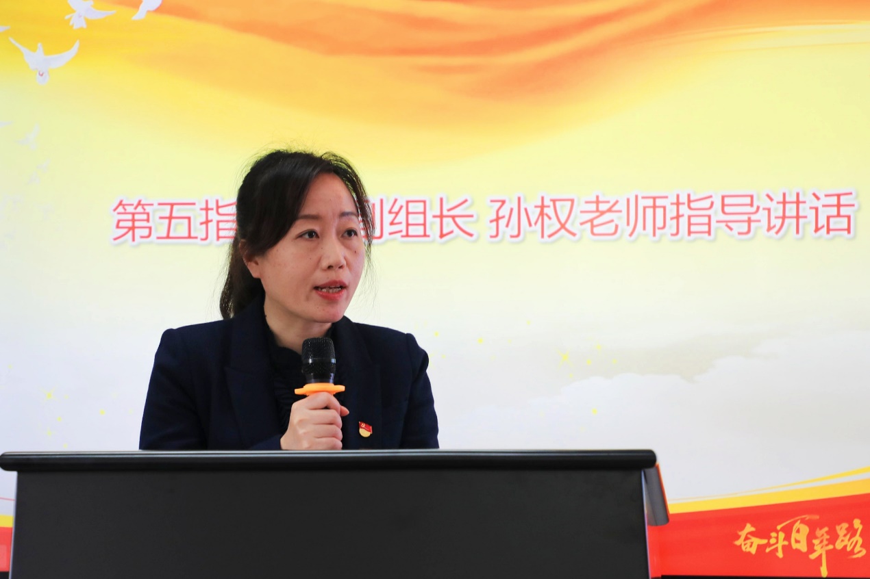 第五指导组副组长孙权作指导讲话。她表示,JAVxxx 党委要深入贯彻学校党委关于开展党史学习教育的工作要求,把开展党史学习教育作为一项重大的政治任务。一是要坚持正确的理论指导和政治方向,紧密围绕学懂弄通做实党的创新理论,坚持学习党史和学习新中国史、改革开放史、社会主义发展史,同学习校史相结合。二是要高度重视,精心组织,将理论学习和实践活动相结合,全方位、多层次地组织学习教育活动;三是要立足JAVxxx ,确保把全院师生党员的学习积极性调动起来,把党史学习教育和JAVxxx 学科建设发展结合起来,把JAVxxx 浓厚的学习氛围展现出来,确保学习走深走实取得实效。