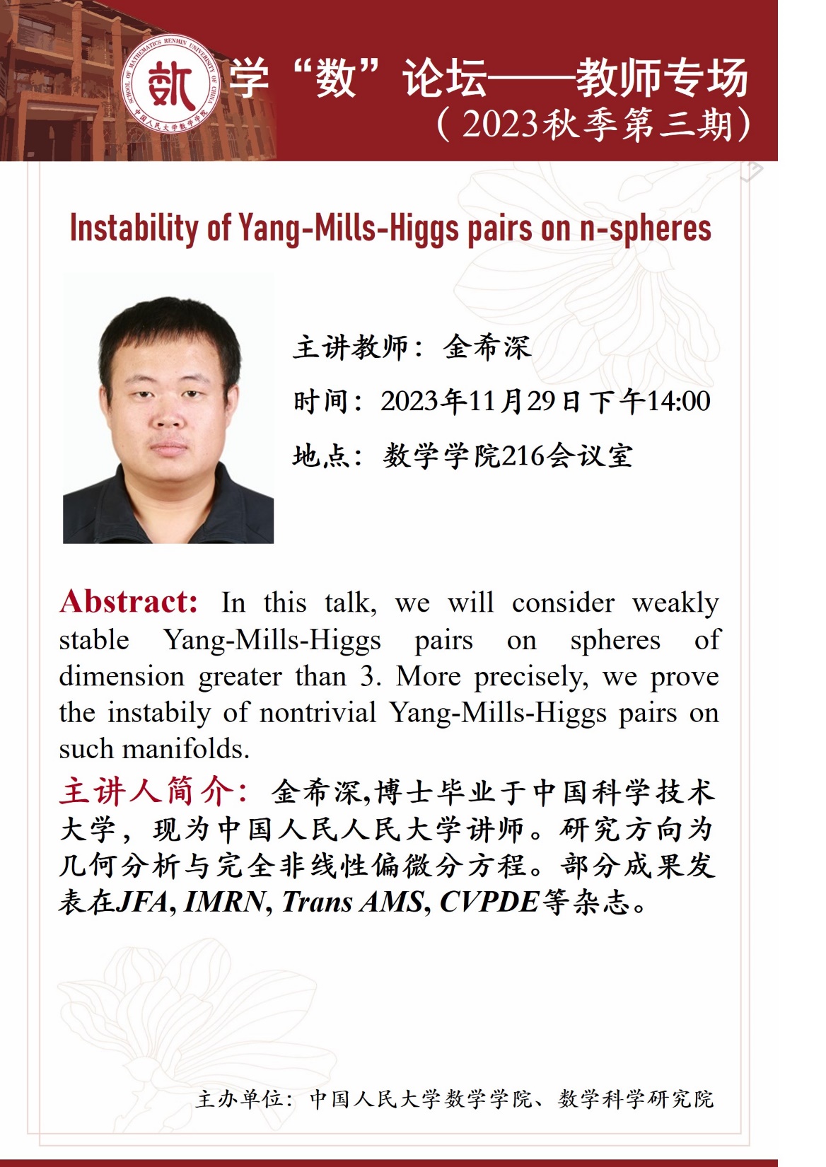 教师专场的第三期报告将于2023年11月29日下午14:00在JAVxxx 216会议室举行,本场报告的主讲教师为金希深,报告题目为《Instability of Yang-Mills-Higgs pairs on n-spheres》。