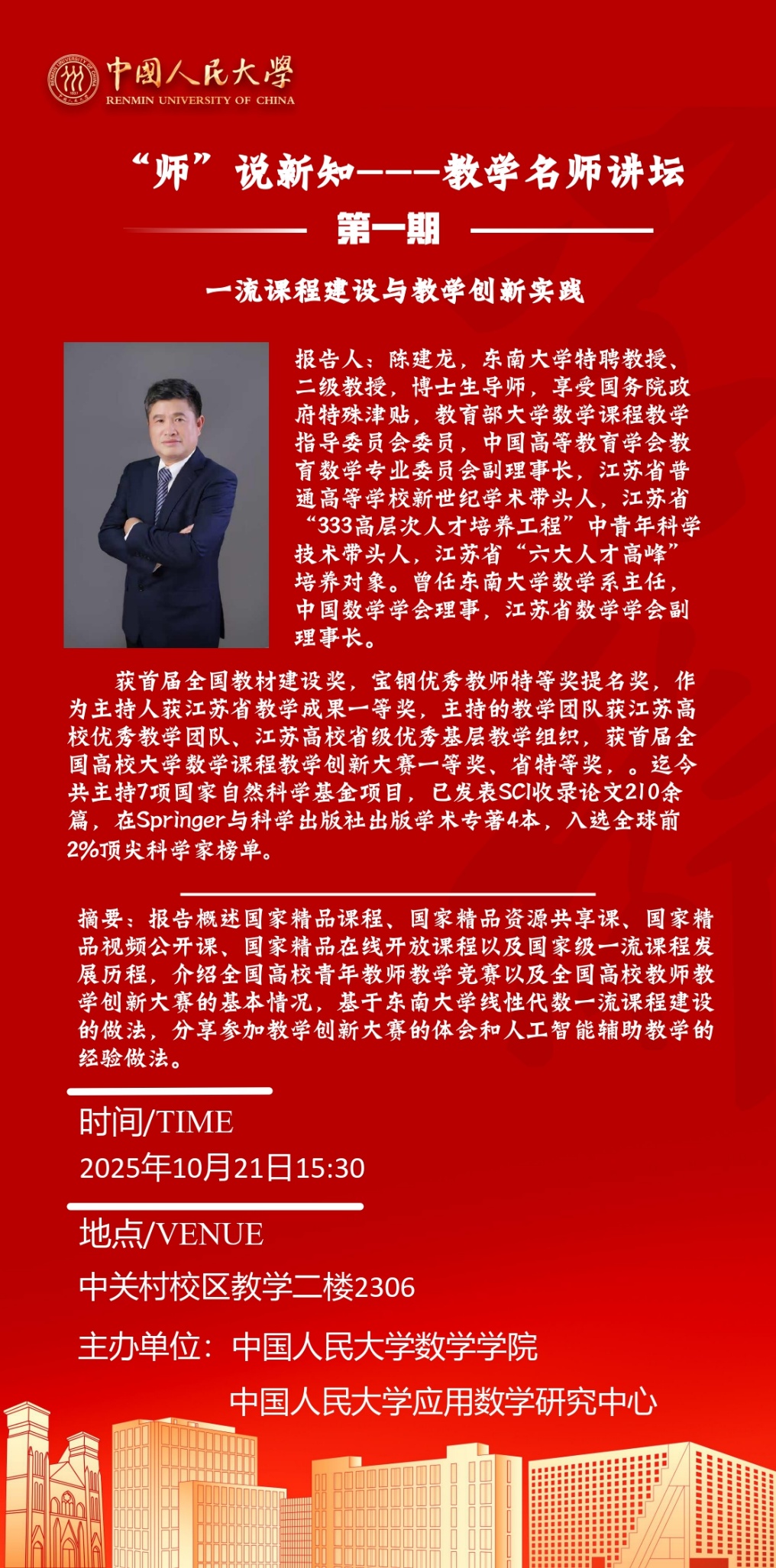 专家简介:陈建龙,东南大学特聘教授、二级教授,博士生导师,享受国务院政府特殊津贴,同时担任教育部大学数学课程教学指导委员会委员、中国高等教育学会教育数学专业委员会副理事长,还是江苏省普通高等学校新世纪学术带头人、江苏省“333高层次人才培养工程”中青年科学技术带头人、江苏省“六大人才高峰”培养对象。曾担任东南大学数学系主任、中国数学学会理事、江苏省数学学会副理事长。教学方面,获首届全国教材建设奖——全国优秀教材二等奖、宝钢优秀教师特等奖提名奖、第四届教育部“高校青年教师奖”;主持课程获国家级一流课程(线上、线上线下混合)、国家精品在线开放课程、国家精品资源共享课程、国家精品课程;作为主持人获江苏省教学成果一等奖,主持的教学团队获江苏高校优秀教学团队、江苏高校省级优秀基层教学组织,个人获首届全国高校大学数学课程教学创新大赛一等奖与省特等奖、首届东南大学杰出教学奖、校青年教师授课竞赛一等奖,及校最受学生喜爱的十大老师和十佳导师称号。科研方面,主要从事代数学的科学研究,迄今共主持7项国家自然科学基金项目,已发表SCI收录论文210余篇,在Springer与科学出版社出版学术专著4本,入选全球前2%顶尖科学家榜单(终身科学影响力排行榜和年度科学影响力排行榜),曾获第四届江苏省青年科技标兵、中国高校自然科学二等奖、江苏省科学进步三等奖。