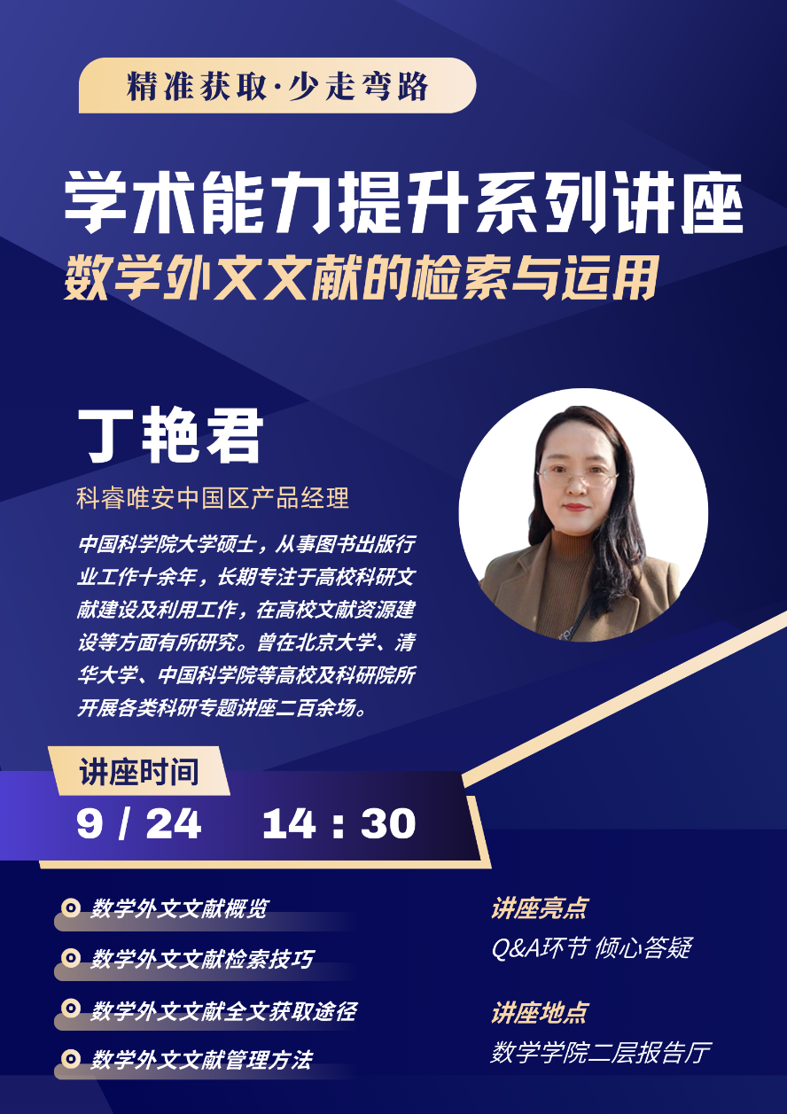 学术能力提升系列讲座旨在促进知识更新、提升研究能力、激发创新思维、拓宽学术视野、培养学术道德与规范。其中检索与利用外文文献作的能力是学术能力的重要组成部分,也是师生必备的“导航技能”,希望此次“数学外文文献的检索与高效运用”讲座能够搭建一座通往数学科研前沿的桥梁,助力学术之旅。