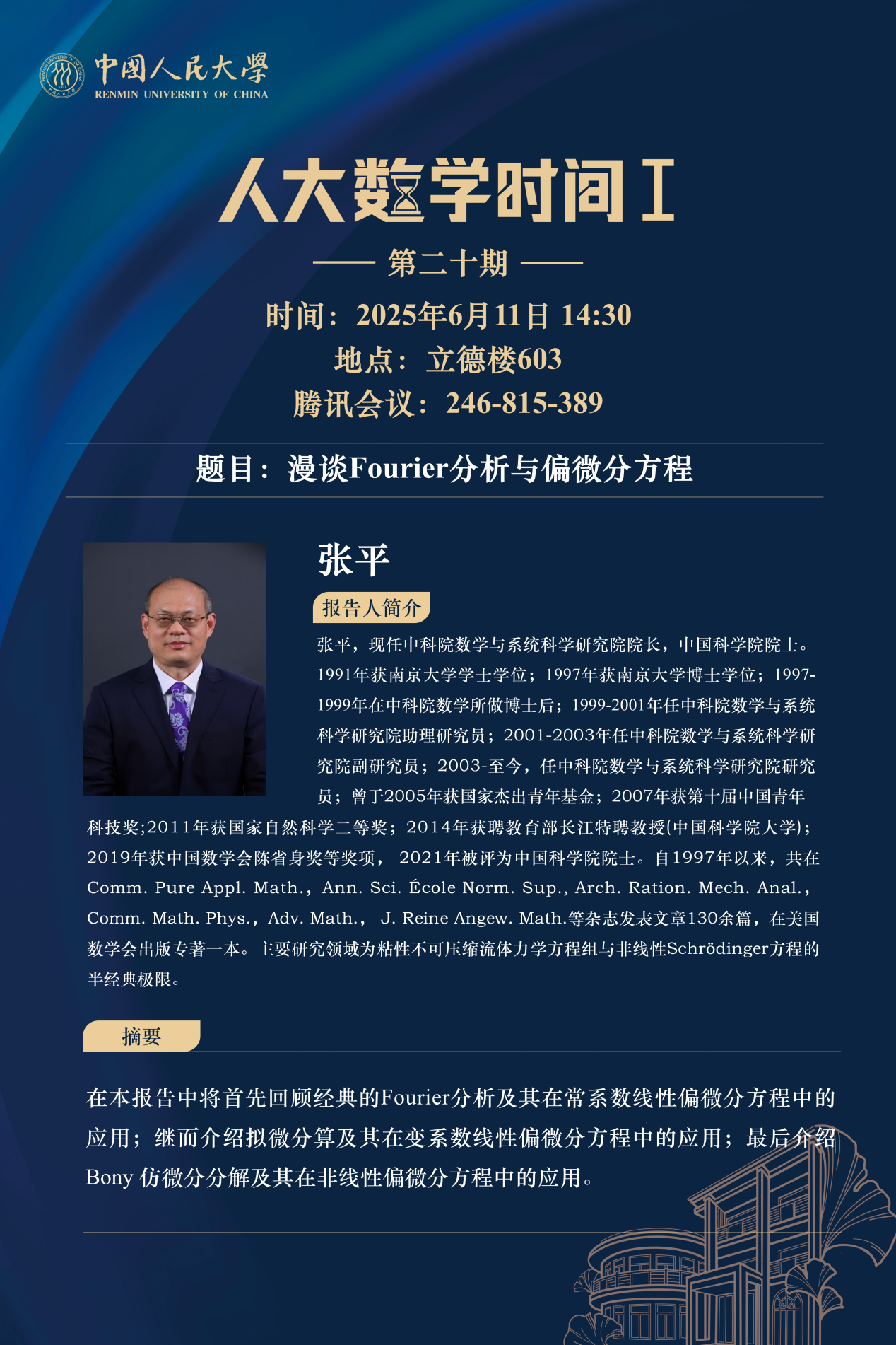 为促进学科交流融合、拓宽师生学术视野、释放科研创新活力,助力人大数学学科走向一流,JAVxxx 设立“人大数学时间”,以专题研讨、高端学术论坛为载体,搭建数学思想充分碰撞、优秀人才不断涌流、创造活力竞相迸发的舞台。“人大数学时间”将持之以恒,久久为功,立志通过交流与创新、提出重大问题,引领数学学科及相关领域的创新与发展,成为对我国数学发展有贡献意义的平台。以下为“人大数学时间I”第二十期信息: