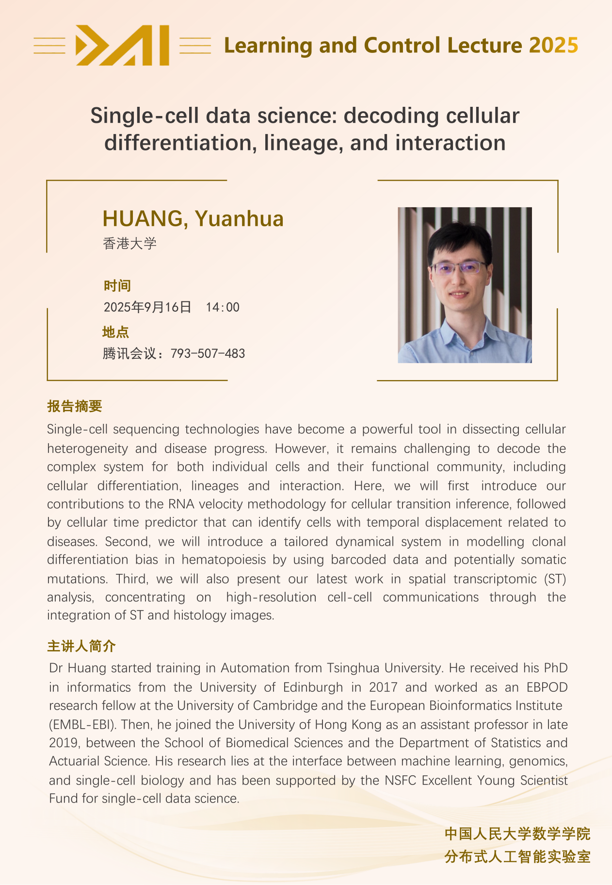 讲座预告|Single-cell data science: decoding cellular differentiation, lineage, and interaction