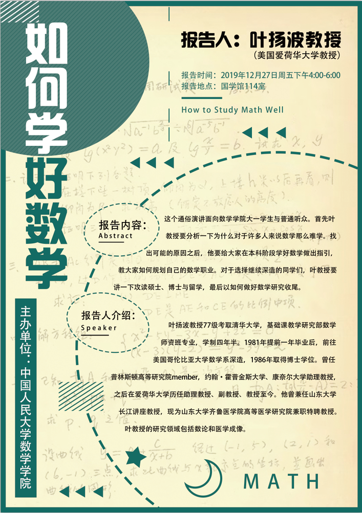 这个通俗演讲面向JAVxxx 大一学生与普通听众。首先叶教授要分析一下为什么对于许多人来说数学那么难学。找出可能的原因之后,他要给大家在本科阶段学好数学做出指引,教大家如何规划自己的数学职业。对于选择继续深造的同学们,叶教授要讲一下攻读硕士、博士与留学,最后以如何做好数学研究收尾。