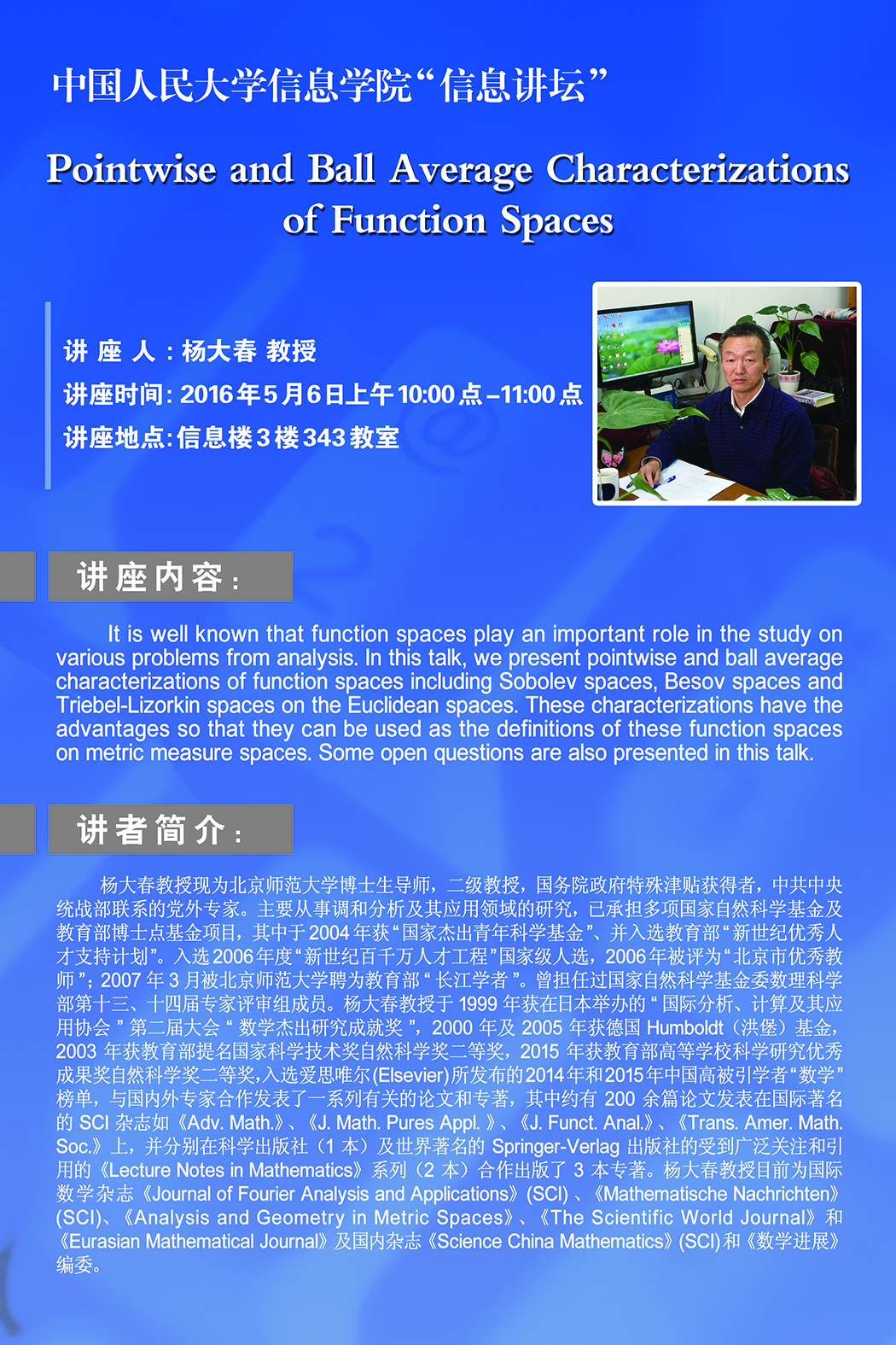 杨大春教授现为北京师范大学博士生导师,二级教授,国务院政府特殊津贴获得者,中共中央统战部联系的党外专家。杨大春教授主要从事调和分析及其应用领域的研究,已承担多项国家自然科学基金及教育部博士点基金项目,其中于2004年获“国家杰出青年科学基金”、并入选教育部“新世纪优秀人才支持计划”。入选2006年度“新世纪百千万人才工程”国家级人选,2006年被评为“北京市优秀教师”;2007年3月被北京师范大学聘为教育部“长江学者”。曾担任过国家自然科学基金委数理科学部第十三、十四届专家评审组成员。 杨大春教授于1999年获在日本举办的“国际分析、计算及其应用协会”第二届大会“数学杰出研究成就奖”, 2000年及2005年获德国Humboldt(洪堡)基金, 2003年获教育部提名国家科学技术奖自然科学奖二等奖,2015年获教育部高等学校科学研究优秀成果奖自然科学奖二等奖,入选爱思唯尔(Elsevier)所发布的2014年和2015年中国高被引学者“数学”榜单,与国内外专家合作发表了一系列有关的论文和专著,其中约有200余篇论文发表在国际著名的SCI杂志如《Adv. Math.》、《J. Math. Pures Appl. 》、《J. Funct. Anal.》、《Trans. Amer. Math. Soc.》上,并分别在科学出版社(1本)及世界著名的Springer-Verlag出版社的受到广泛关注和引用的《Lecture Notes in Mathematics》系列(2本)合作出版了3本专著。这些成果受到国内外同行的广泛关注、引用和好评。 杨大春教授目前为国际数学杂志《Journal of Fourier Analysis and Applications》(SCI) 、《Mathematische Nachrichten》(SCI)、《Analysis and Geometry in Metric Spaces》、《The Scientific World Journal》和《Eurasian Mathematical Journal》及国内杂志《Science China Mathematics》(SCI)和《数学进展》编委。 杨大春教授目前已培养14个数学博士,1人任教于美国高校,其余全部任教于国内著名高校, 目前已有教授3人, 副教授8人;1人入选2011年度教育部新世纪优秀人才支持计划,1人获2012年“全国百篇优秀博士论文”提名奖,2人获德国洪堡基金资助, 1人获国家自然科学基金优秀青年基金。