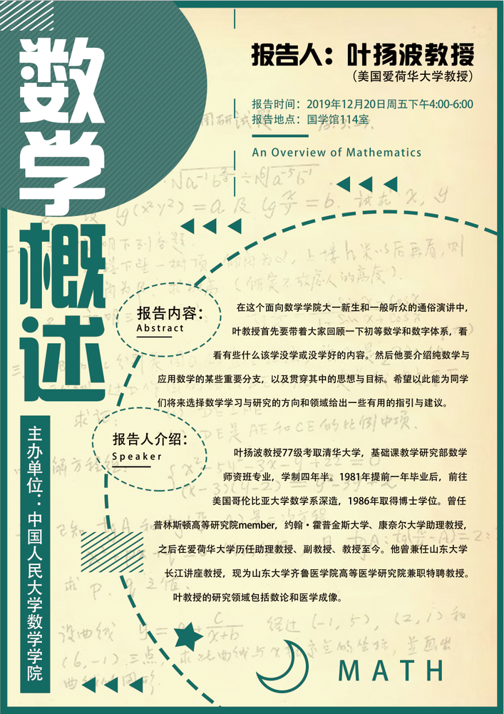 在这个面向JAVxxx 大一新生和一般听众的通俗演讲中,叶教授首先要带着大家回顾一下初等数学和数字体系,看看有些什么该学没学或没学好的内容。然后他要介绍纯数学与应用数学的某些重要分支,以及贯穿其中的思想与目标。希望以此能为同学们将来选择数学学习与研究的方向和领域给出一些有用的指引与建议。