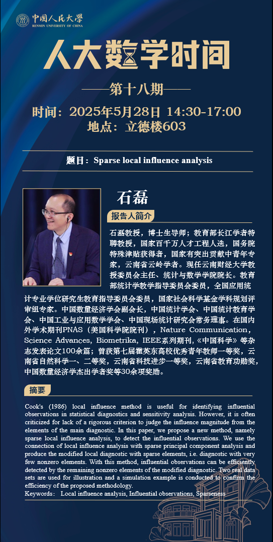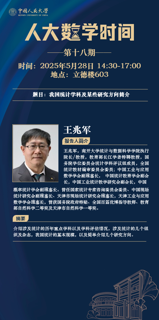 为促进学科交流融合、拓宽师生学术视野、释放科研创新活力,助力人大数学学科走向一流,JAVxxx 设立“人大数学时间”,以专题研讨、高端学术论坛为载体,搭建数学思想充分碰撞、优秀人才不断涌流、创造活力竞相迸发的舞台。“人大数学时间”将持之以恒,久久为功,立志通过交流与创新、提出重大问题,引领数学学科及相关领域的创新与发展,成为对我国数学发展有贡献意义的平台。以下为“人大数学时间I”第十八期信息: