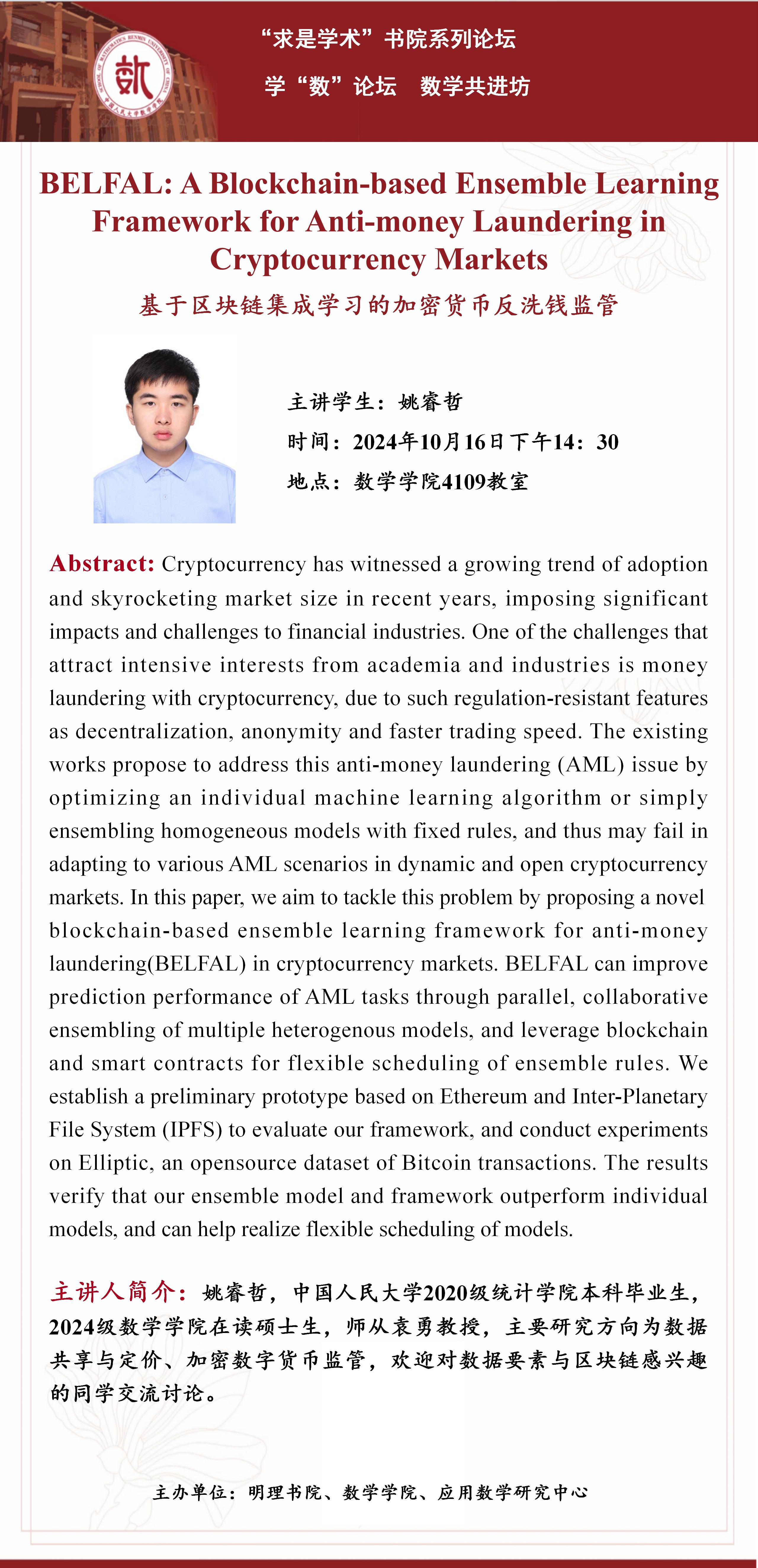 本场报告类型为学术类,将于2024年10月16日(星期三)下午14:30,在JAVxxx 4109教室进行,报告主讲人为硕士一年级姚睿哲同学,报告题目为《BELFAL: A Blockchain-based Ensemble Learning Framework for Anti-money Laundering in Cryptocurrency Markets》