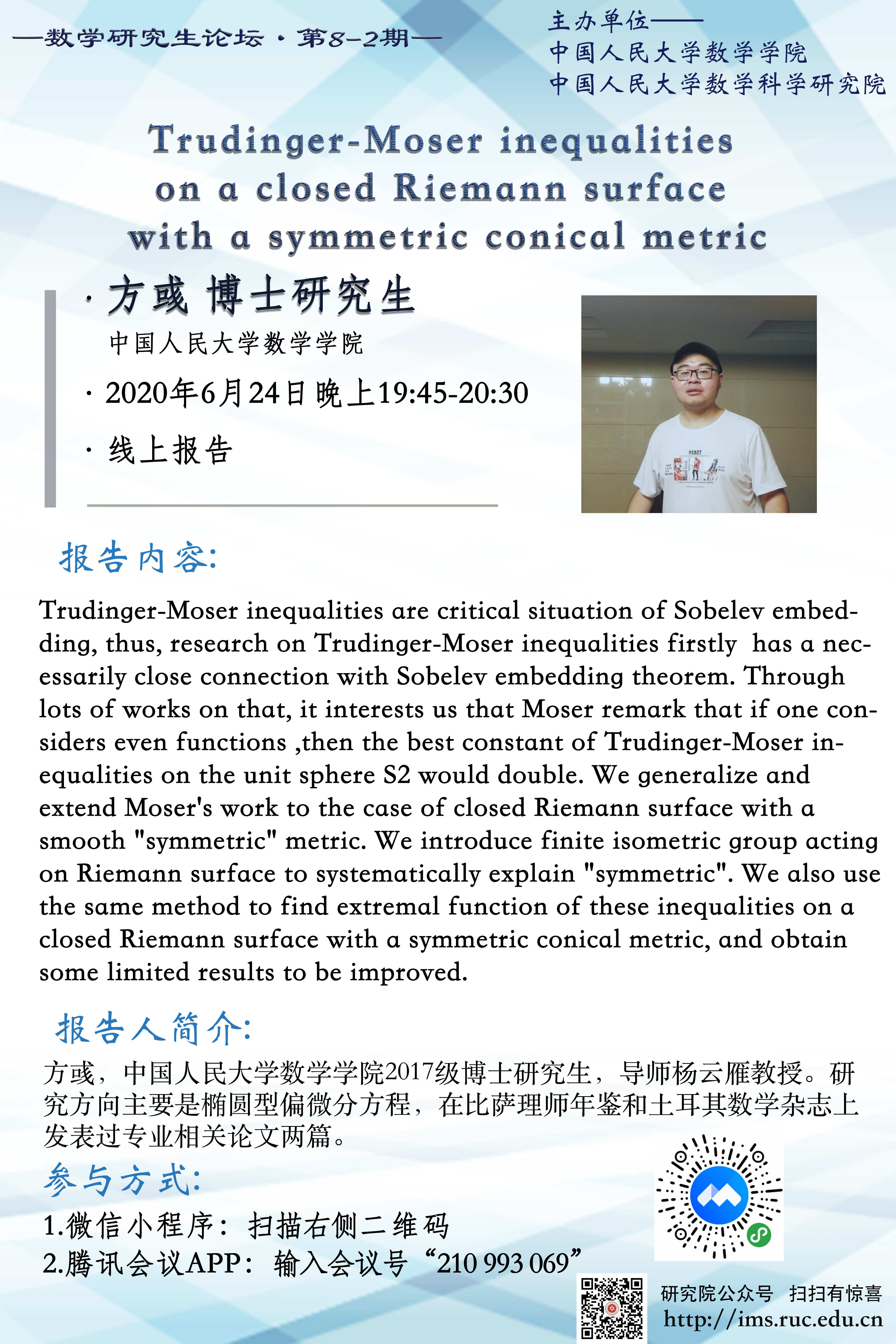 JAVxxx 研究生论坛 8-2期—Trudinger-Moser inequalities on a closed Riemann surface with a symmetric conical metric