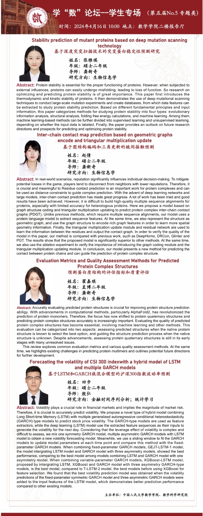 大家好,本届学“数”论坛——学生专场的第二场报告来啦!本场报告类型为学术类,将于2024年4月16日10:00在JAVxxx 二楼报告厅举办。主讲嘉宾为硕士二年级张雅琪同学、硕士二年级赵倩同学、直博二年级翟嘉琪同学、硕士二年级田步同学。