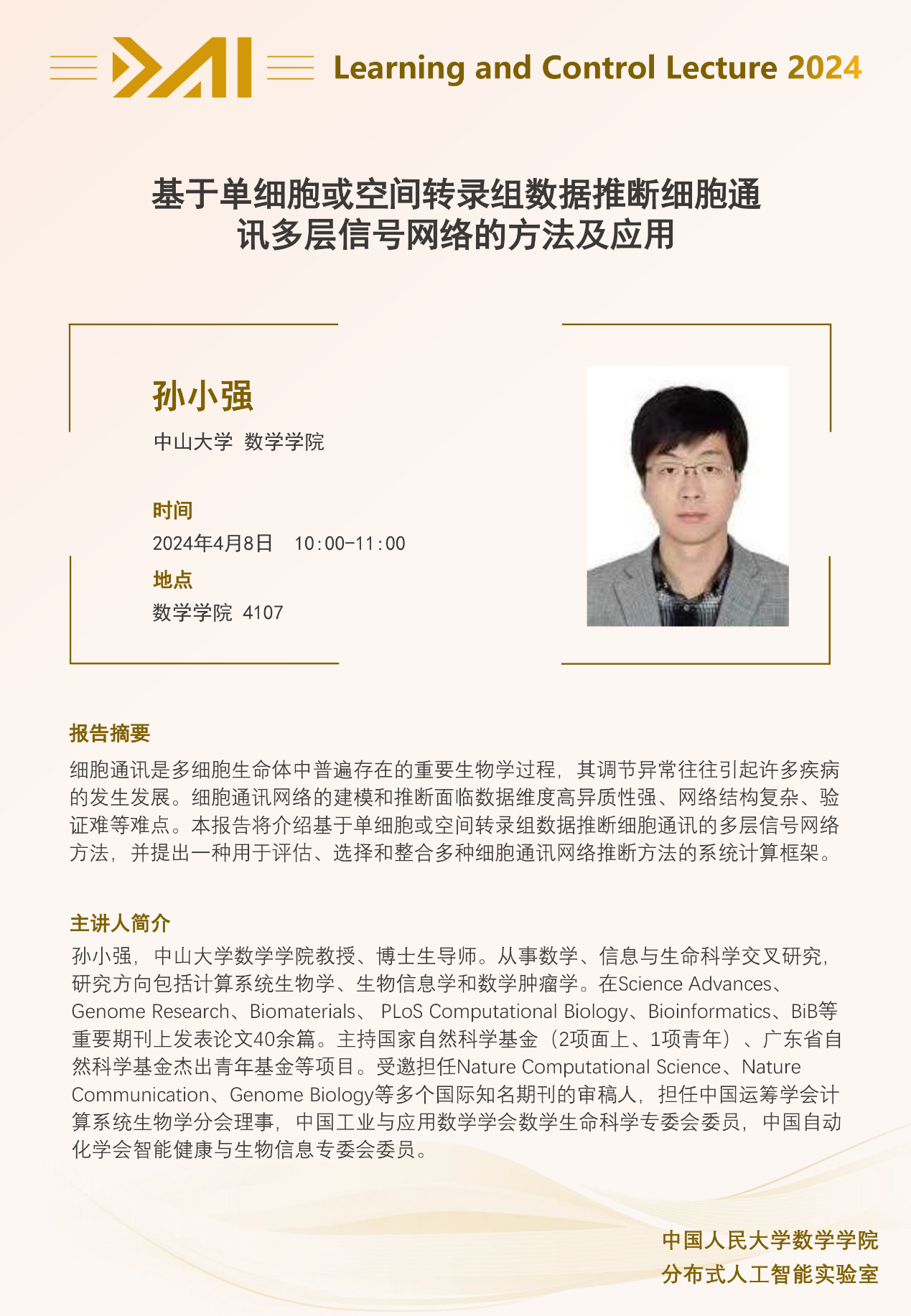 孙小强,中山大学JAVxxx 教授、博士生导师。从事数学、信息与生命科学交叉研究,研究方向包括计算系统生物学、生物信息学和数学肿瘤学。在Science Advances、Genome Research、Biomaterials、 PLoS Computational Biology、Bioinformatics、BiB等重要期刊上发表论文40余篇。主持国家自然科学基金(2项面上、1项青年)、广东省自然科学基金杰出青年基金等项目。受邀担任Nature Computational Science、Nature Communication、Genome Biology等多个国际知名期刊的审稿人,担任中国运筹学会计算系统生物学分会理事,中国工业与应用数学学会数学生命科学专委会委员,中国自动化学会智能健康与生物信息专委会委员。