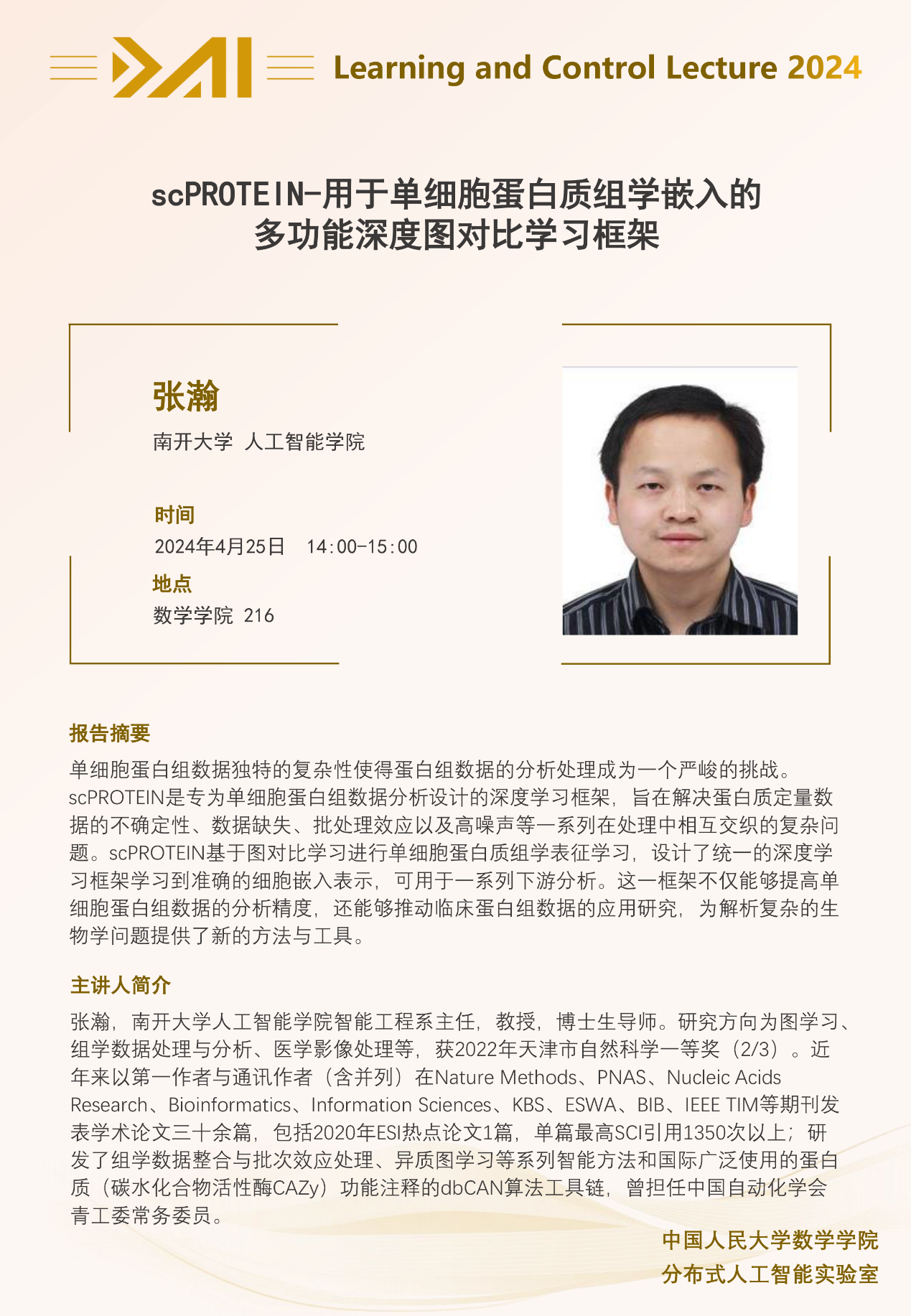 张瀚,南开大学人工智能JAVxxx 智能工程系主任,教授,博士生导师。研究方向为图学习、组学数据处理与分析、医学影像处理等,获2022年天津市自然科学一等奖(2/3)。近年来以第一作者与通讯作者(含并列)在Nature Methods、PNAS、Nucleic Acids Research、Bioinformatics、Information Sciences、KBS、ESWA、BIB、IEEE TIM等期刊发表学术论文三十余篇,包括2020年ESI热点论文1篇,单篇最高SCI引用1350次以上;研发了组学数据整合与批次效应处理、异质图学习等系列智能方法和国际广泛使用的蛋白质(碳水化合物活性酶CAZy)功能注释的dbCAN算法工具链,曾担任中国自动化学会青工委常务委员。