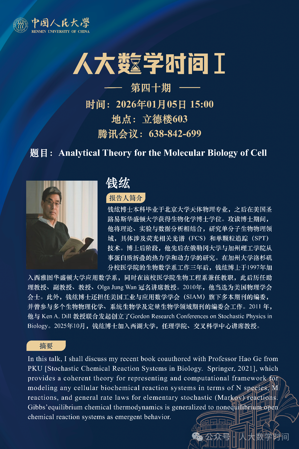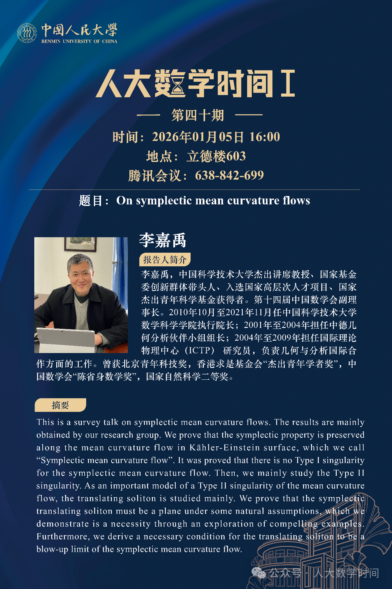 为促进学科交流融合、拓宽师生学术视野、释放科研创新活力,助力人大数学学科走向一流,JAVxxx 设立“人大数学时间”,以专题研讨、高端学术论坛为载体,搭建数学思想充分碰撞、优秀人才不断涌流、创造活力竞相迸发的舞台。“人大数学时间”将持之以恒,久久为功,立志通过交流与创新、提出重大问题,引领数学学科及相关领域的创新与发展,成为对我国数学发展有贡献意义的平台。以下为“人大数学时间I”第四十期信息: