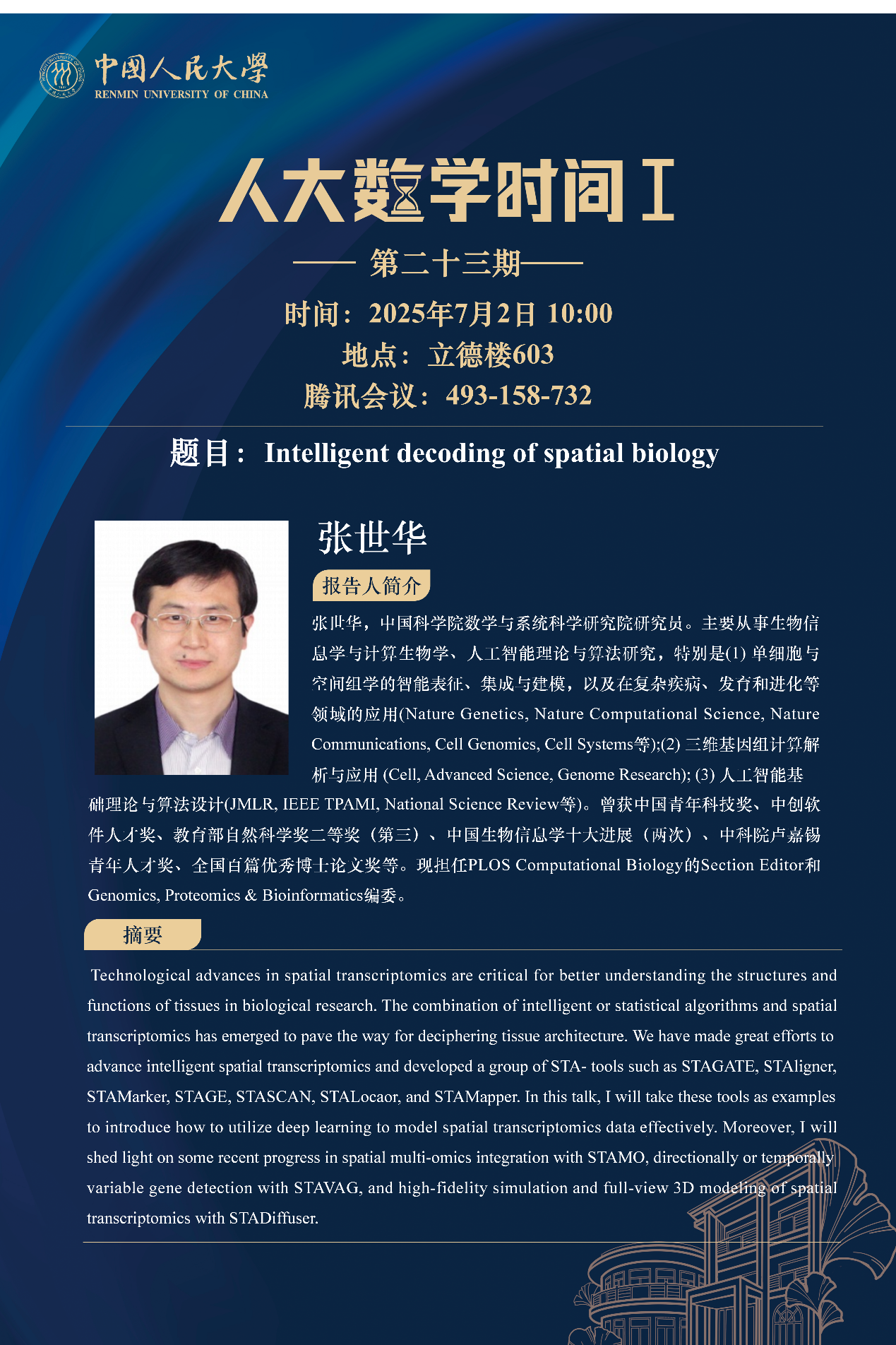 张世华,中国科JAVxxx 数学与系统科学研究院研究员。主要从事生物信息学与计算生物学、人工智能理论与算法研究,特别是(1) 单细胞与空间组学的智能表征、集成与建模,以及在复杂疾病、发育和进化等领域的应用(Nature Genetics, Nature Computational Science, Nature Communications, Cell Genomics, Cell Systems等); (2) 三维基因组计算解析与应用 (Cell, Advanced Science, Genome Research); (3) 人工智能基础理论与算法设计(JMLR, IEEE TPAMI, National Science Review等)。曾获中国青年科技奖、中创软件人才奖、教育部自然科学奖二等奖(第三)、中国生物信息学十大进展(两次)、中科院卢嘉锡青年人才奖、全国百篇优秀博士论文奖等。现担任PLOS Computational Biology的Section Editor和Genomics, Proteomics & Bioinformatics编委。