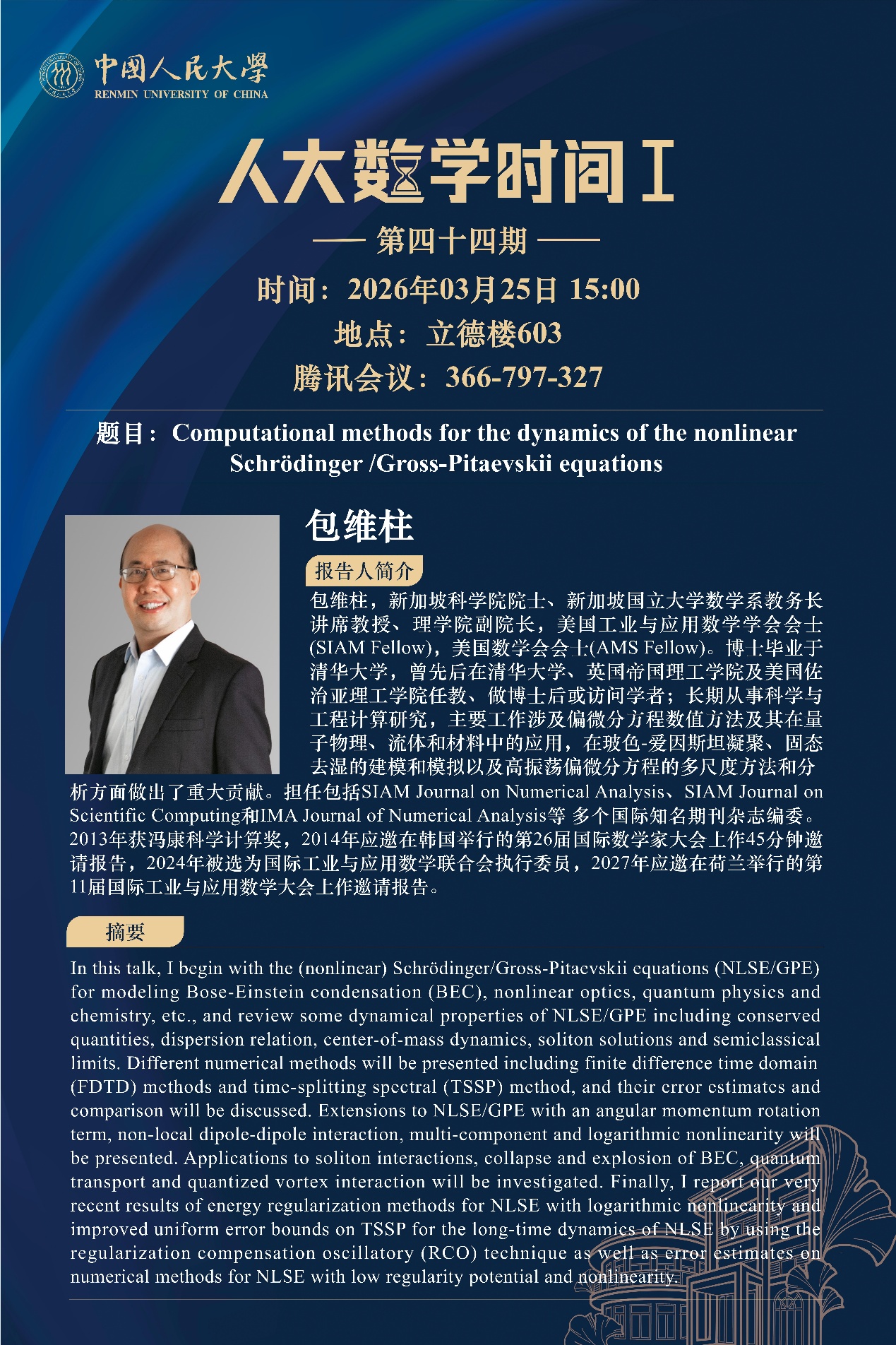 包维柱,新加坡科学院院士、新加坡国立大学数学系教务长讲席教授、理学院副院长,美国工业与应用数学学会会士(SIAM Fellow),美国数学会会士(AMS Fellow)。博士毕业于清华大学,曾先后在清华大学、英国帝国理工学院及美国佐治亚理工学院任教、做博士后或访问学者;长期从事科学与工程计算研究,主要工作涉及偏微分方程数值方法及其在量子物理、流体和材料中的应用,在玻色-爱因斯坦凝聚、固态去湿的建模和模拟以及高振荡偏微分方程的多尺度方法和分析方面做出了重大贡献。担任包括SIAM Journal on Numerical Analysis、SIAM Journal on Scientific Computing和IMA Journal of Numerical Analysis等 多个国际知名期刊杂志编委。2013年获冯康科学计算奖,2014年应邀在韩国举行的第26届国际数学家大会上作45分钟邀请报告,2024年被选为国际工业与应用数学联合会执行委员,2027年应邀在荷兰举行的第11届国际工业与应用数学大会上作邀请报告。