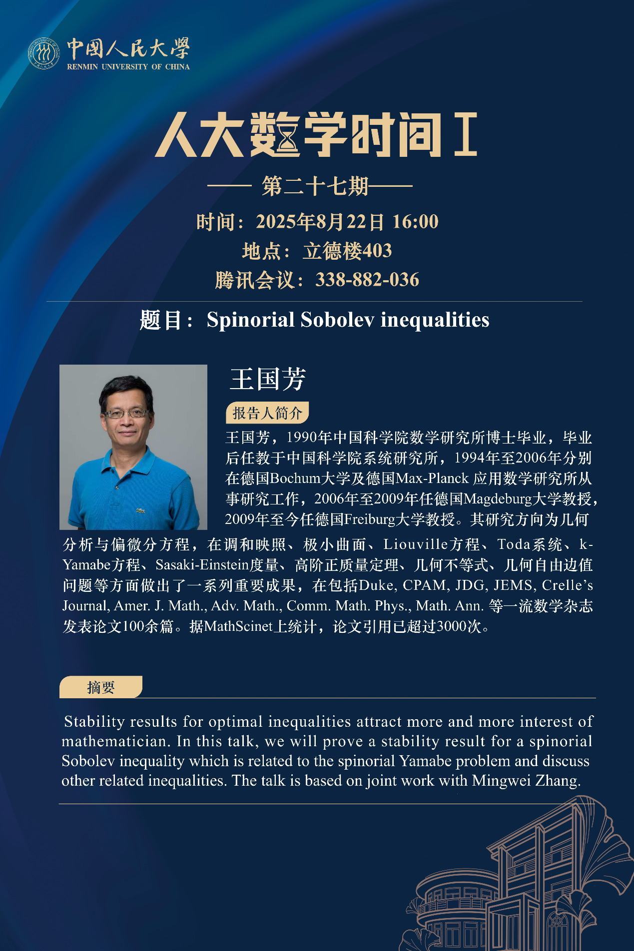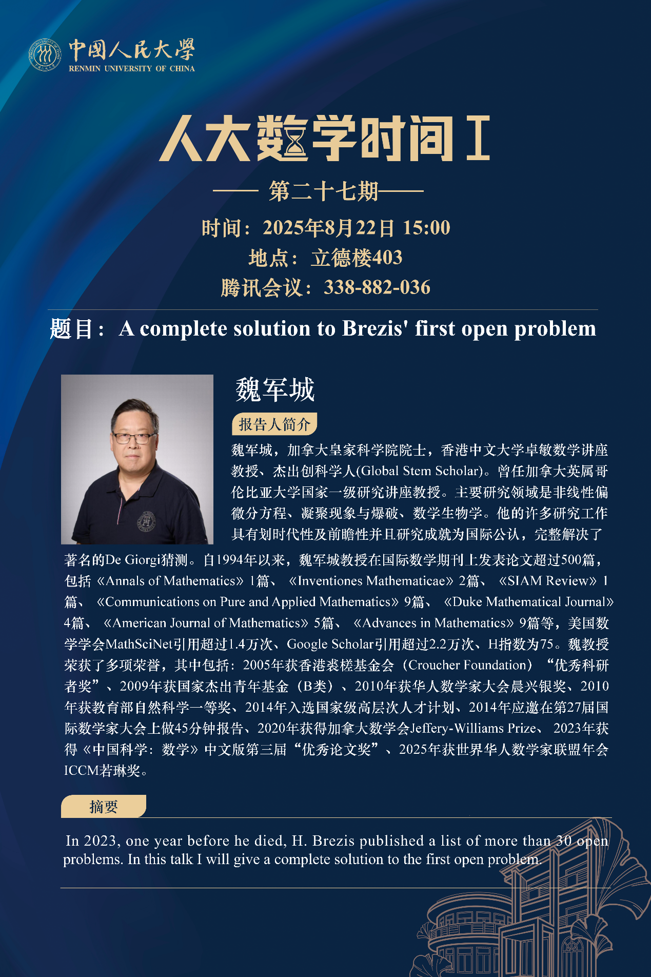 为促进学科交流融合、拓宽师生学术视野、释放科研创新活力,助力人大数学学科走向一流,JAVxxx 设立“人大数学时间”,以专题研讨、高端学术论坛为载体,搭建数学思想充分碰撞、优秀人才不断涌流、创造活力竞相迸发的舞台。“人大数学时间”将持之以恒,久久为功,立志通过交流与创新、提出重大问题,引领数学学科及相关领域的创新与发展,成为对我国数学发展有贡献意义的平台。以下为“人大数学时间I”第二十七期信息: