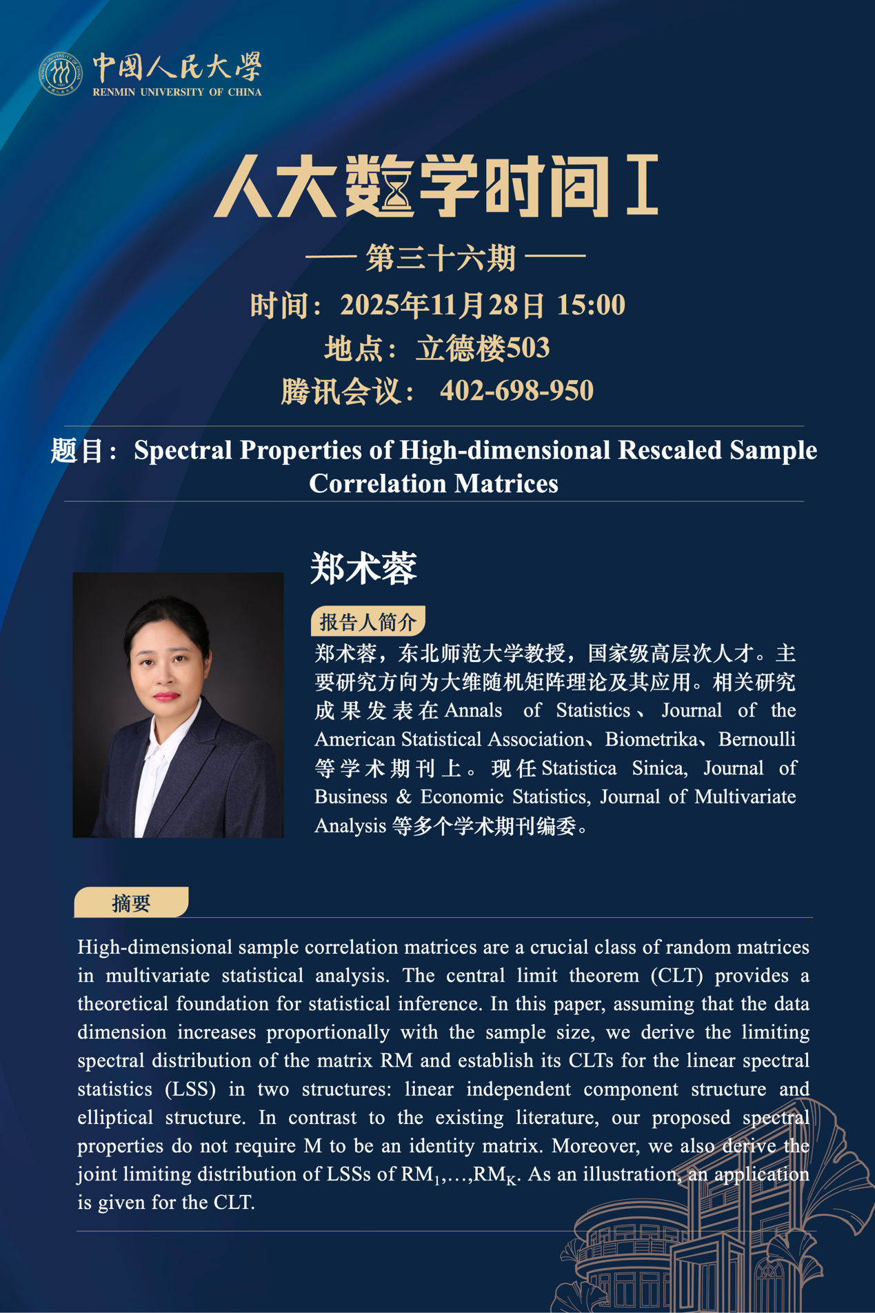 为促进学科交流融合、拓宽师生学术视野、释放科研创新活力,助力人大数学学科走向一流,JAVxxx 设立“人大数学时间”,以专题研讨、高端学术论坛为载体,搭建数学思想充分碰撞、优秀人才不断涌流、创造活力竞相迸发的舞台。“人大数学时间”将持之以恒,久久为功,立志通过交流与创新、提出重大问题,引领数学学科及相关领域的创新与发展,成为对我国数学发展有贡献意义的平台。以下为“人大数学时间I”第三十六期信息: