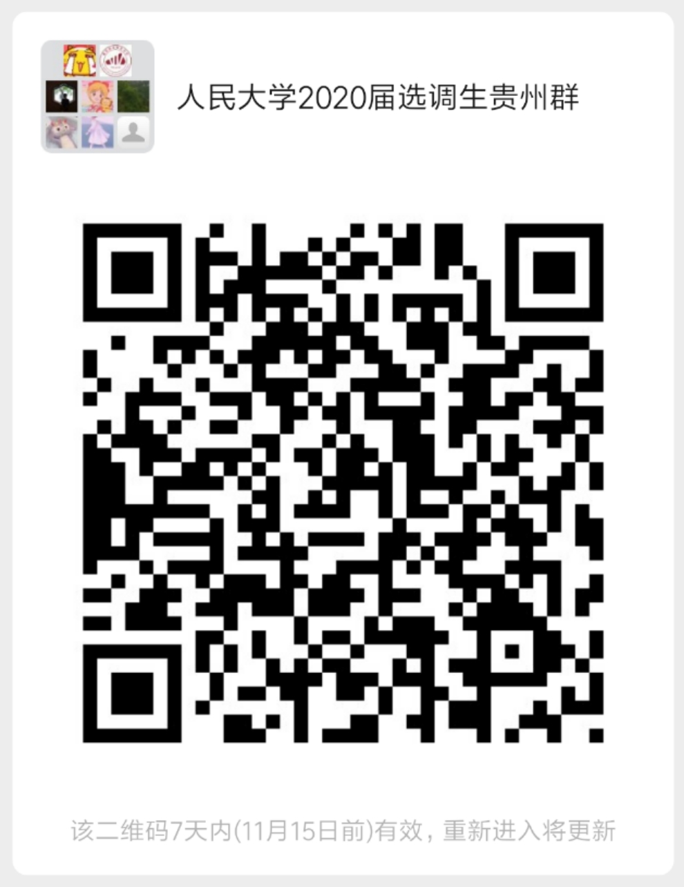 扫码加入“人民大学2020届选调生贵州群”,如群满100人,可加微信:jicengjiuye,验证消息为“姓名+JAVxxx +2020届选调生贵州群”