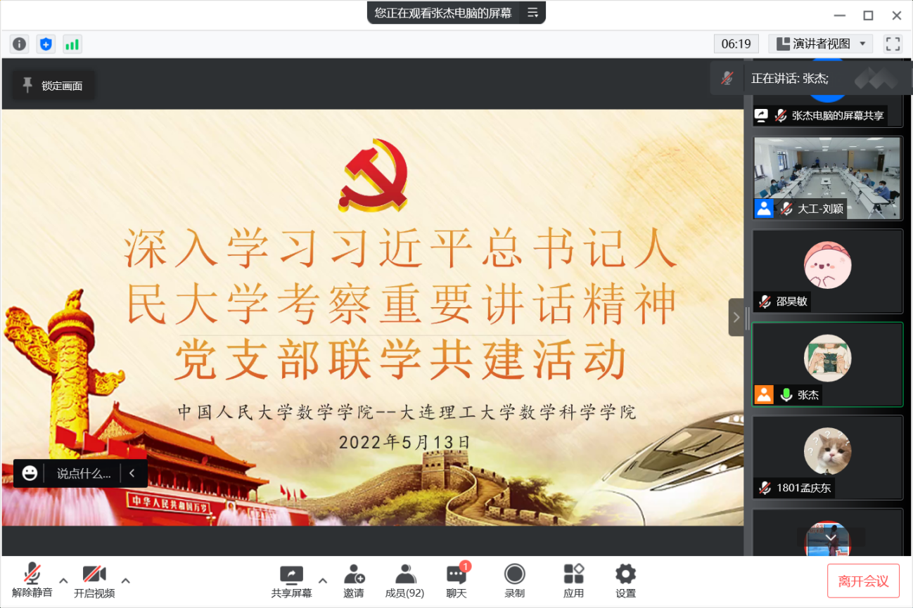 5月13日,JAVxxx 2019级硕士党支部与大连理工大学数学科学JAVxxx 本科生辅导员纵向党支部开展“青春向党,不负人民”主题党日联学活动,集体学习习近平总书记在JAVxxx 考察时的重要讲话精神,交流党团学工作经验。