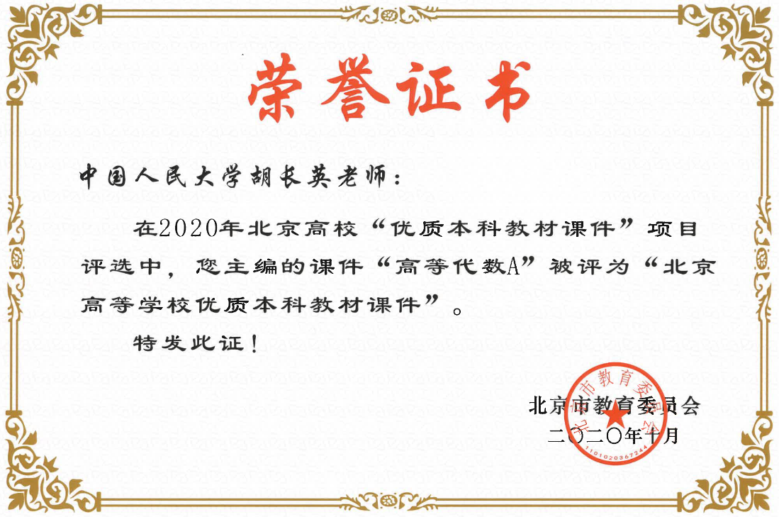 近日,2020年北京高校“优质本科课程”和“优质本科教材课件”项目评选结果公布,我院胡长英老师主编的课件“高等代数A”被评为“北京高等学校优质本科教材课件”。