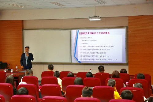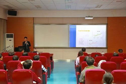 国际交流处张毅博老师依次介绍了学校国家公派留学项目,校长奖学金项目,联合培养项目,寒暑假短期项目以及实习项目等,阐述了这些项目的特点优势、申请流程、语言要求等问题。并鼓励各位同学把握机会,积极参加出国留学项目,并指出,出国留学有利于同学们开阔视野,并为未来的发展提供了更广阔的空间。