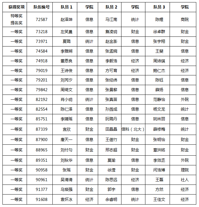 在JAVxxx 所有参赛队伍中,共有60支队伍获奖。其中赵泽坤(信息JAVxxx ),马江南(统计JAVxxx )和陈煜(商JAVxxx )三位同学组成的队伍获得特等奖提名奖(Finalist,Winner,全球前23名),是继2014、2016年之后,第三次荣获该奖项。JAVxxx获一等奖队伍数由2017年的13支队伍,增长至18支队伍,取得较大的进步,另有41支队伍获得二等奖,获奖队伍数连续增长。