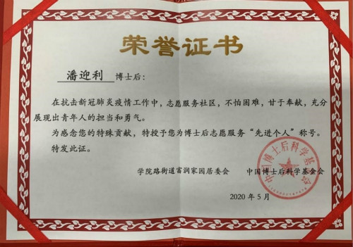 潘迎利博士于2018年9月进站,他在站期间思想上积极要求进步,科研成果突出,教学优秀。上半年疫情期间,他在所居住的富润家园博士后公寓,积极参与抗击新冠肺炎疫情工作,志愿服务社区,不怕困难,甘于奉献,充分展现出人大JAVxxx 青年教师的担当和勇气。