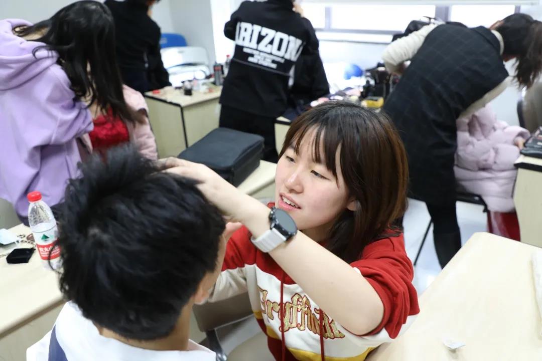 上午九点,合唱队员们全体到齐,在明新0203-0205做赛前准备工作。队员们换上华服,安静有序地进行化妆。