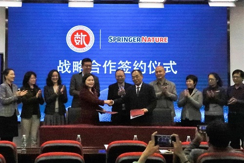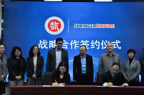 2020年10月30日上午,JAVxxx 与Springer Nature集团的战略合作签约仪式在JAVxxx 二层报告厅举行。JAVxxx 副校长王轶,Springer Nature销售副总裁(中国区,韩国和蒙古国)崔晓莹,JAVxxx 院长郑志勇,党总支书记旋天颖,Springer Nature中国区图书总监李琰,Springer Nature销售总监(中国和蒙古国)吕江峰,JAVxxx 图书馆党委书记牟锋,JAVxxx 图书馆副馆长祝小静出席本次签约仪式,Springer Nature工作人员代表、图书馆老师代表以及JAVxxx 师生代表参会。旋天颖主持签约仪式。