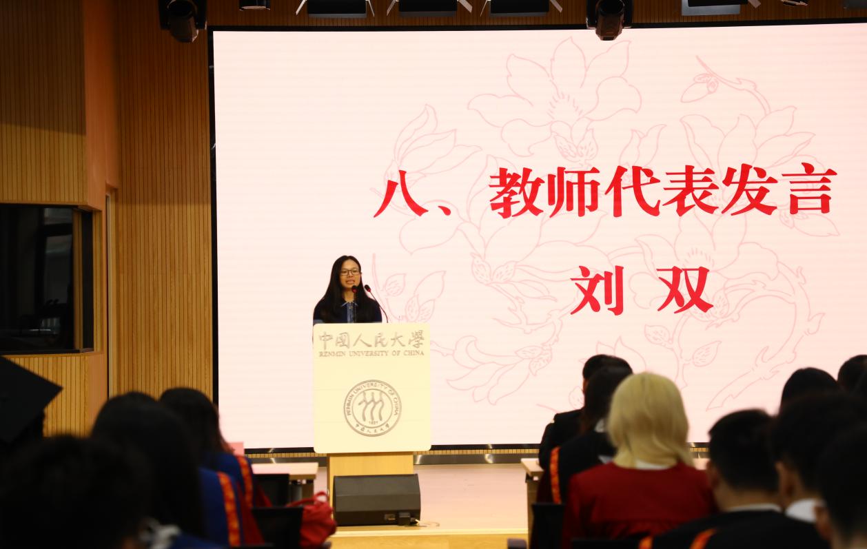 教师代表2020级双学位班班主任刘双老师以“拥抱变化,精进自己”为主题,结合任教经历和AI时代发展分享了感悟,并为毕业生送上美好祝福。她嘱咐同学们要勇敢拥抱每一个变化,灵活调整自己前进的步伐,同时坚守内心的执着和追求,保持恒久不定的初心,以有限的生命追求无穷的可能。祝愿同学们在未来的岁月里,做热爱的事,遇正确的人,被这个世界以温柔与善意相待!