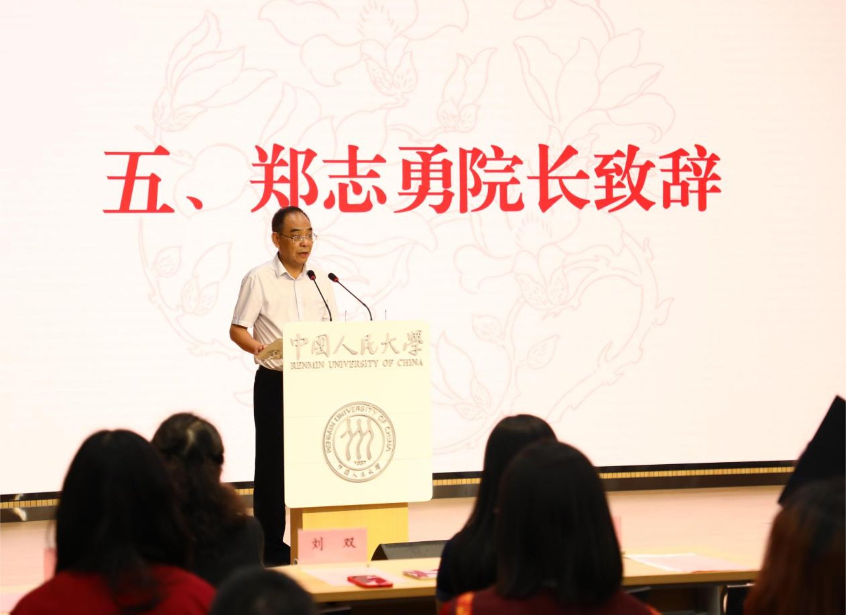 在雄壮的国歌声中,毕业大会拉开帷幕。青格勒图部长首先致辞,他对122位圆满完成学业的毕业生表示热烈的祝贺,向毕业生们送上最真挚的祝福,并提出三点期望:第一,志存高远,脚踏实地。希望同学们在追求理想的道路上坚守实事求是校训的标准,踏实地走好人生每一步,铭记人大人的优良作风;第二,精进本领,勇担重任。实现理想的道路是挑战重重的,希望同学们不畏困难,饱含家国情怀,秉持专业知识,在未来的发展之路上勇于担当时代责任;第三,积极乐观,健康成长。大家在以后的学习、工作中劳逸结合,保持愉悦的心情、健康的体魄,精彩生活、活出精彩。最后,青格部长嘱咐同学们要始终牢记习近平总书记的谆谆教诲,继承优良传统、赓续红色血脉、坚守精神品格,不忘“复兴栋梁、强国先锋”的使命,用奋斗践行“青春向党、不负人民”的忠诚信念,为中国式现代化挺膺担当!