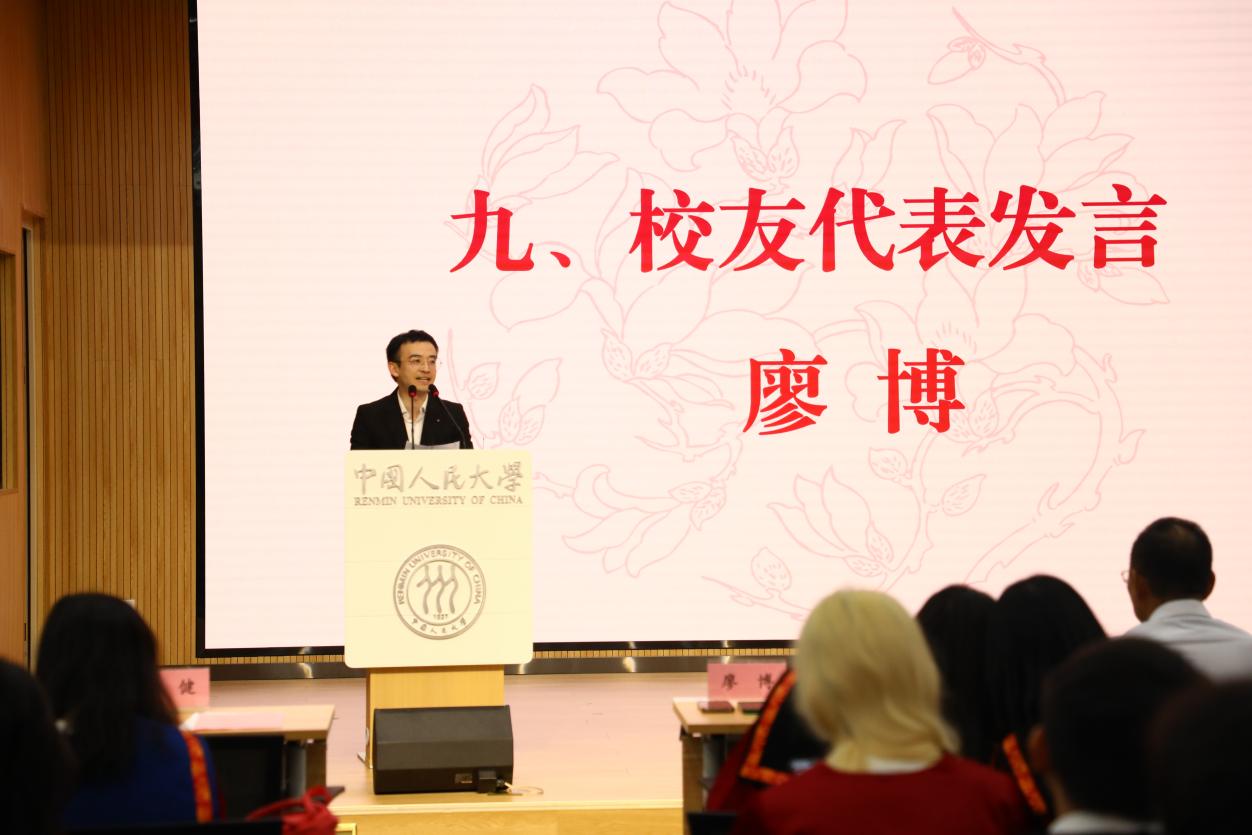 校友代表2009级本科生廖博发言讲话,他向即将迈入社会的学弟学妹们分享了三点人生感悟。第一,信心胜于黄金。信心的建立基于实战经验和专业素养,要将终身学习、敢于担当作为个人特质;第二,把握当下是理性选择。勉励同学们戒眼高手低、戒空喊口号、戒急功近利、戒盲目蛮干,在任何情境下,要把握当下、悦纳自我;第三,锻造自己专属且适配的朋友圈。校园时代的情感是最为纯真、最为淳朴的,校友间不掺杂任何利益的对话往往能一语点醒梦中人,这就是友谊的力量,校友情谊也将成为同学们的有力支持和坚强后盾。