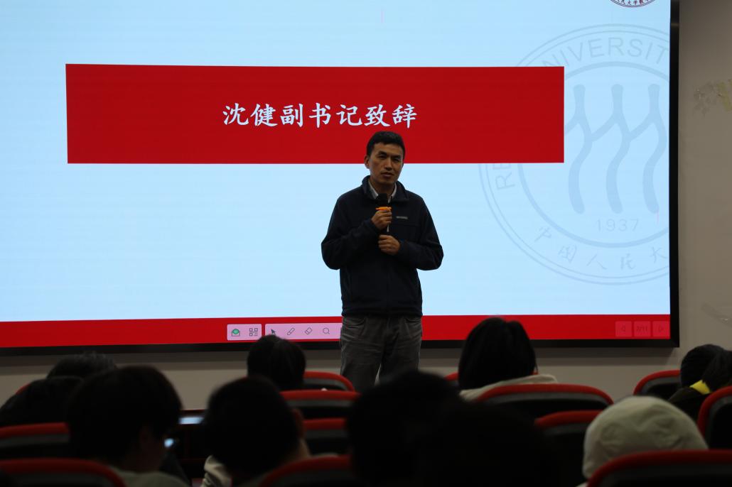 大会在庄严的国歌声中隆重开始,党委副书记沈健老师致辞。他充分肯定了本次共青团JAVxxx 第二次代表大会召开的意义,强调坚持“以党建带团建”的工作思路,勉励广大团员代表坚定听党话、跟党走的政治信念,提高身份意识,在思想、工作及生活中发挥先锋模范作用。沈健老师代表JAVxxx 向大会筹备工作组成员以及全体参会代表表示衷心感谢,并预祝本次团员代表大会召开及新一届团委委员选举工作取得圆满成功。