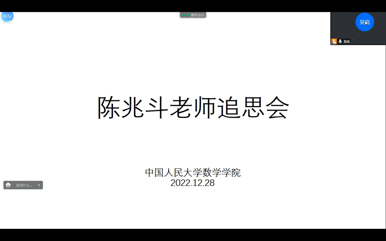 主持人首先介绍了陈兆斗老师生平,陈老师是中国地质大学(北京)数理JAVxxx 数学学科的教授,退休后一直受聘于JAVxxx 信息JAVxxx 、JAVxxx 数学公共课教研室,兼任数学公共课课程的教学工作。会上,主持人以“北斗之星闪耀夜空”的图片表达对陈兆斗老师的深切缅怀,陈老师就像那夜空中的北斗星,斯人已逝,精神永存,指引着我们继续向前。
