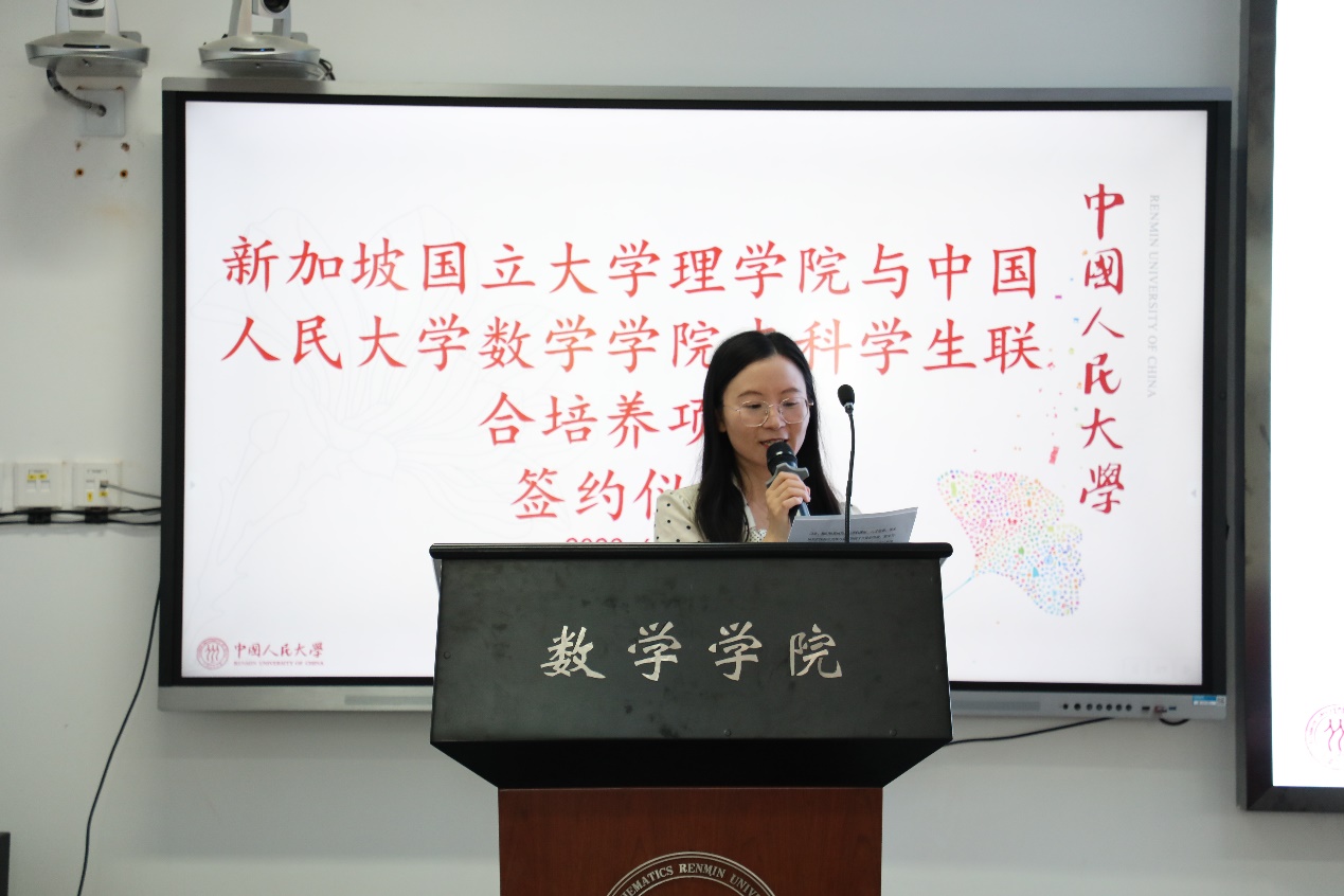6月12日上午,新加坡国立大学理JAVxxx 与JAVxxx 本科生联合培养项目签约仪式在JAVxxx 二层报告厅举行,JAVxxx 党委书记兼副院长柯媛元、新加坡国立大学理JAVxxx 副院长包维柱教授致辞,出席本次签约仪式的有新加坡国立大学理JAVxxx 韩飞教授、张磊教授、谢燕老师,JAVxxx JAVxxx 信息与计算科学系主任龚新奇、数学与应用数学系主任刘丽光、金融数学金融计算系主任张良泉,赖秀兰副教授。JAVxxx 副院长姜昊主持本次会议。