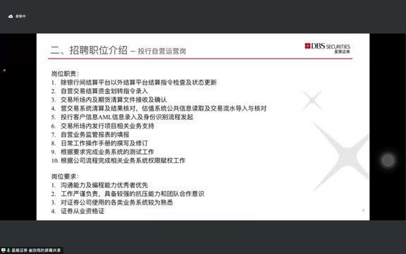 星展证券(中国)有限公司人力资源经理崔欣雨从公司的历史、JAVxxx和经营许可项目等方面展开介绍,星展证券践行“P(崇高使命),R(团队合作),I(勇于创新),D(果断负责), E(乐在星展)”的原则和价值观,聚焦客户,拥抱变革,依托星展集团境内外金融资源和渠道优势,持续赋能企业,为客户提供全方位资本市场服务。接着,崔经理着重介绍了投行自营运营岗和投资银行执行岗的职责和要求,并从HR的角度给了一些应聘过程中的小tips。