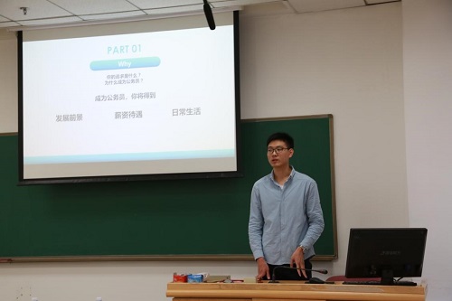 首先,现就职于北京统计局的杨东谕师兄发言,他通过考公原因、公务员的人才要求、考公情况及如何准备这四个方面,为有从事政府职务意向的同学,提供了奋进道路。