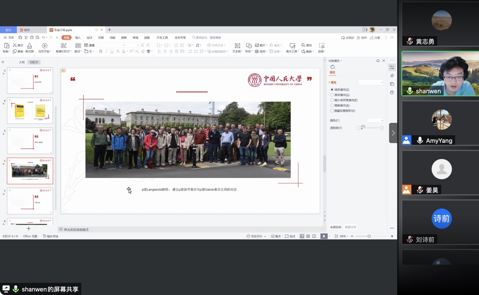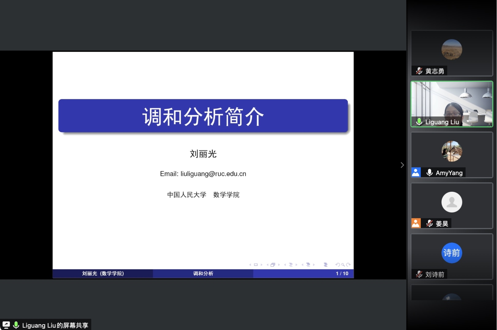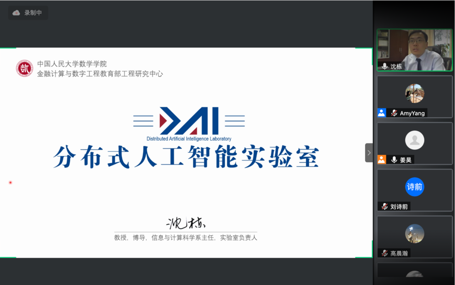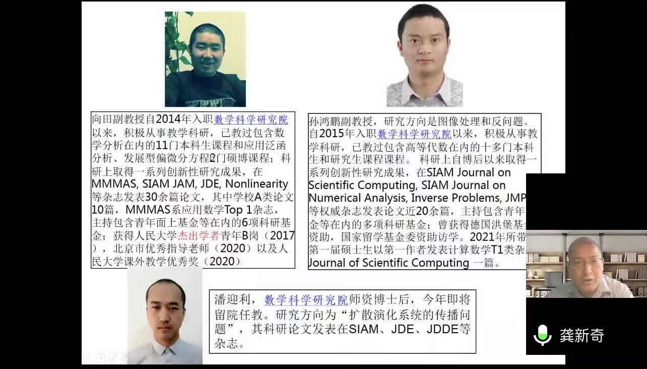 之后,各位老师依次介绍了人大数学学科的研究方向和领域。欧耀彬教授介绍了流体力学方向的相关研究;龚新奇教授介绍了生物数学方向与数学科学研究院的研究团队与研究内容;刘丽光教授针对调和分析方向做了详细介绍;王善文副教授就代数方向分享了独到见解并鼓励同学们努力做一名终身学习者;郑涛副教授介绍了复几何和复流形方向的研究进展;杨云雁教授期待大家能够在偏微分方程方向上快速进入状态并做出贡献;张庆彩教授介绍了以黎曼猜想为代表的复变函数方向;王伟教授就控制论方向做出了精彩的阐述,欢迎同学们加入JAVxxx 共同探索数学的魅力。