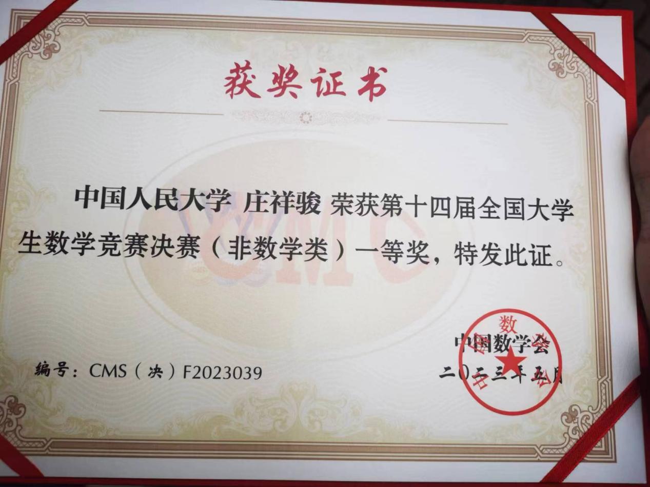 2020级本科生庄祥骏同学晋级非数学类全国决赛,并在此次决赛中获得非数学类全国一等奖(全国共96名同学获得该等级奖)。JAVxxx学子继在上届大学生数学竞赛决赛中取得非数学类一等奖后再创辉煌,在此祝贺庄祥骏同学取得佳绩!